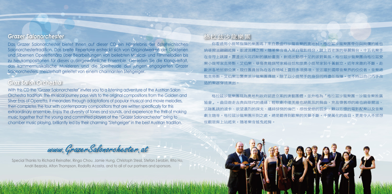 Mit einem einzigartigen transkulturellen Verständnis verleiht das international besetzte Ensemble unter der Leitung des Stehgeigers Klaus Eberle Werken aus der goldenen und silbernen Operettenära einen ganz persönlichen Anstrich und schlät Brücken zwischen Tradition und Zukunft. In seinen Konzerten präsentiert das Grazer Salonorchester immer wieder Werke und Cross-Overs, die begeisterte Komponisten und Arrangeure eigens für dieses Ensemble geschrieben und bearbeitet haben.